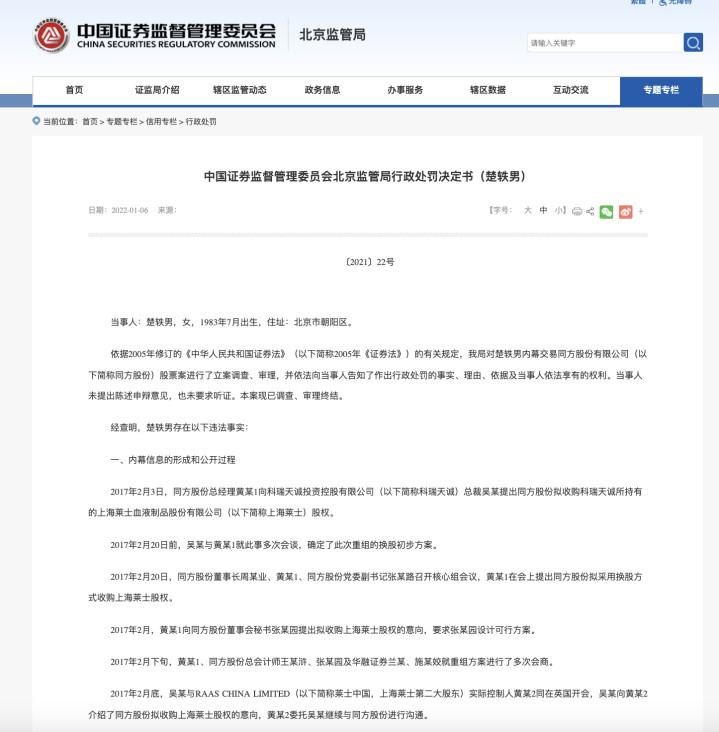 这起震惊资本市场的内幕交易案源于2017年一起庞大的并购计划。当年2月,同方股份提出收购科瑞天诚所持上海莱士股权的计划,交易金额接近300亿元,构成重大资产重组。