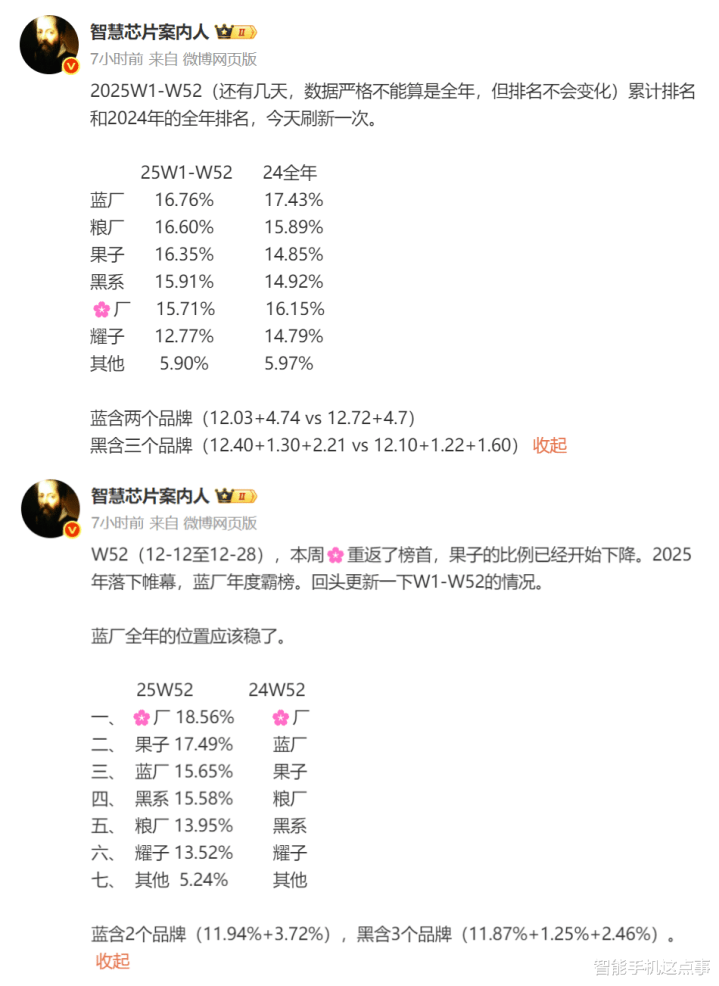 说到这里,博主还给出了第52周(12.12-12.28)的实时战况,华为以18.56%的周份额强势重返单周第一、苹果周份额回落至17.49%、vivo周份额15.65%、OPPO系15.58%、小米13.95%等。